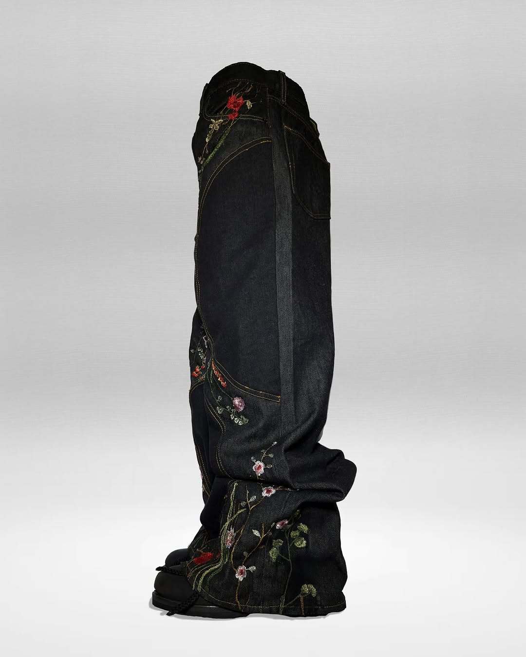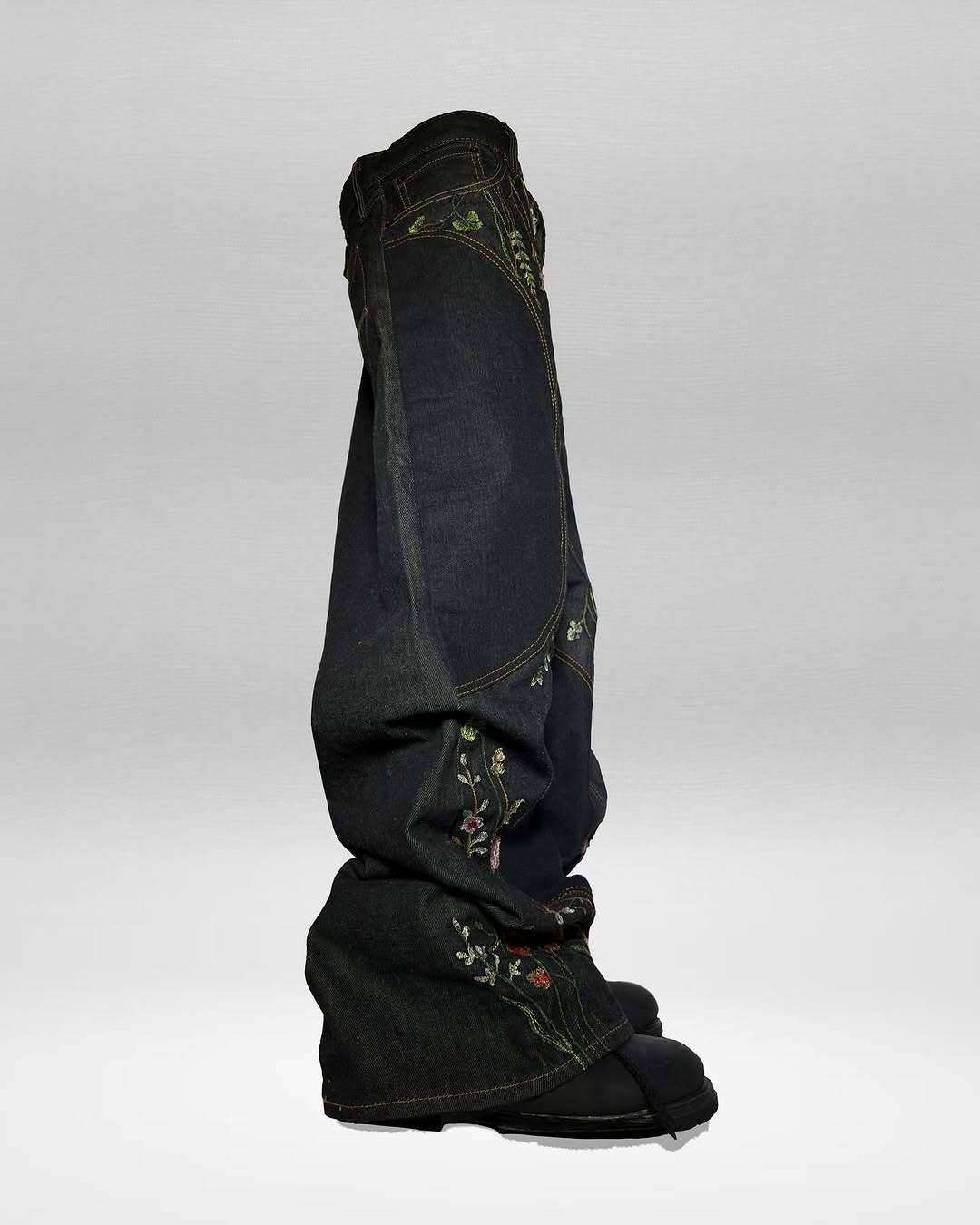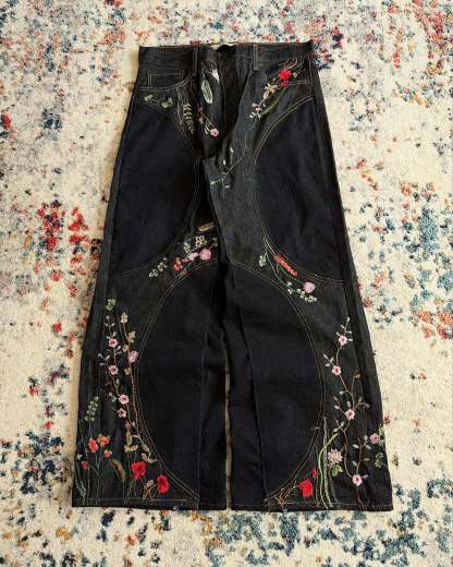 "FLORAL" blends the beauty of nature with streetwear vibes. Featuring 800,000 embroidered stitches depicting a floral paradise, a baggy wide-leg cut for effortless cool, and distressed details with custom leather tags, these jeans let you channel your inner urban nature guardian—where street style meets eco-conscious freedom.